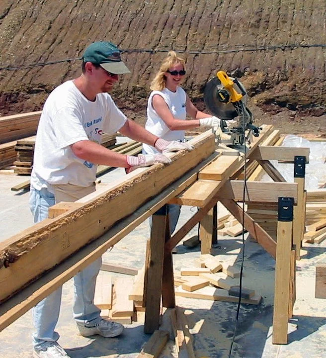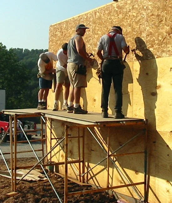 The church construction theme for the last week of July and first week of August was “WALLS”. The wood interior and exterior walls were built, lifted into place, and sheathing attached.