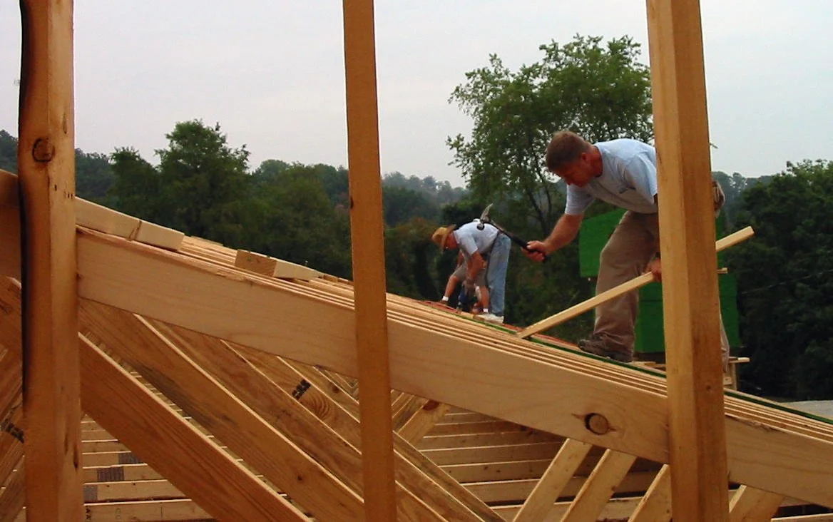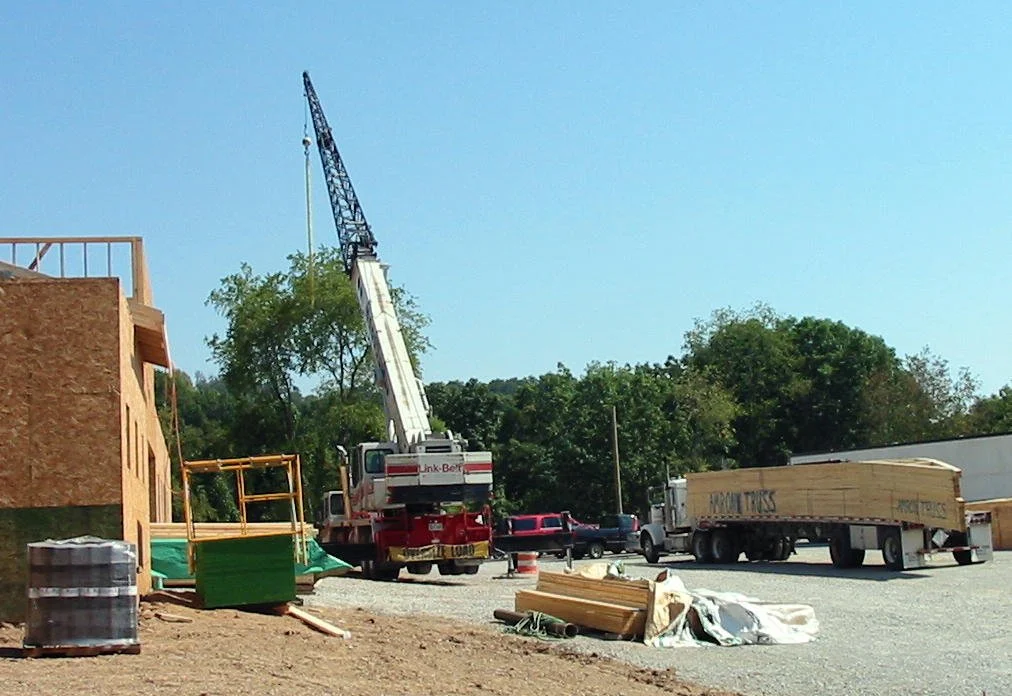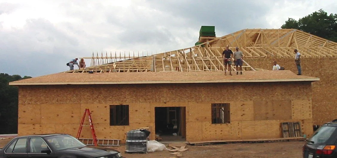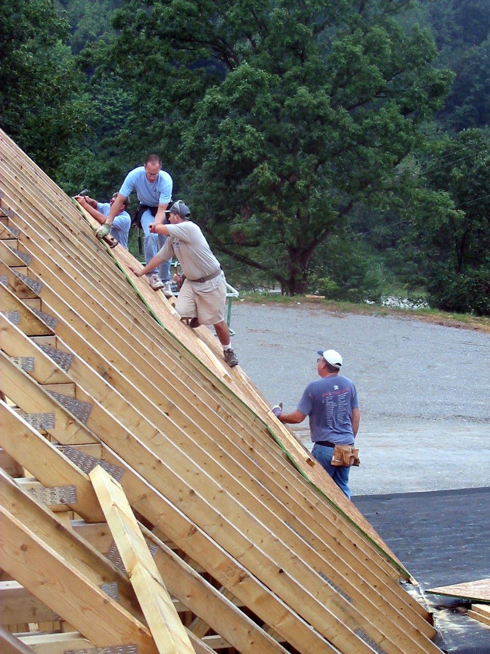 As September began, the church had exterior and interior framed walls, but no roof. The roof trusses were delivered on a large flatbed trailer and lifted into position with a crane. A professional crew installed the trusses and braces. Congregation members and the Laborers for Christ nailed the roof’s plywood decking to the trusses. This was most challenging on the steep roof above the front entrance. The roof deck was completed by the end of the month and roofing felt started to be attached.