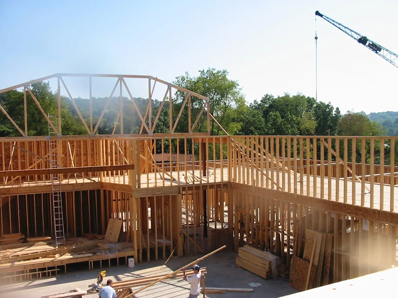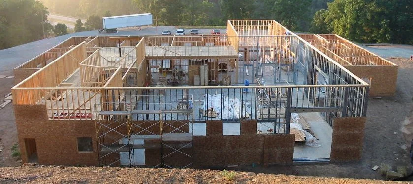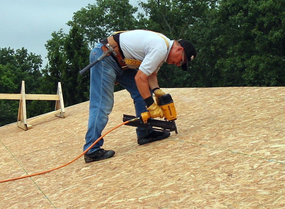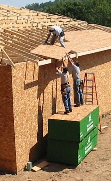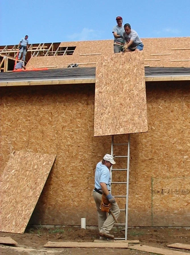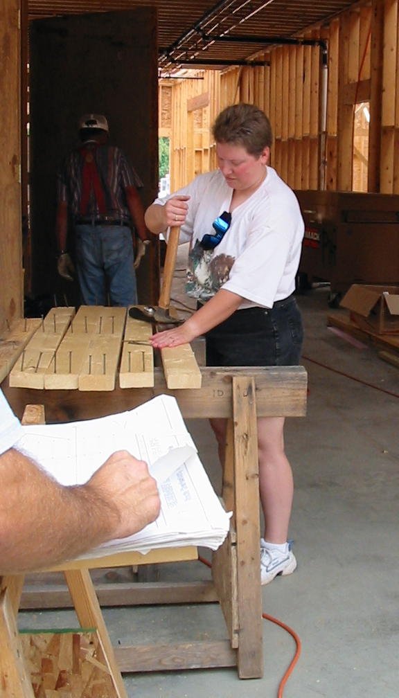 As September began, the church had exterior and interior framed walls, but no roof. The roof trusses were delivered on a large flatbed trailer and lifted into position with a crane. A professional crew installed the trusses and braces. Congregation members and the Laborers for Christ nailed the roof’s plywood decking to the trusses. This was most challenging on the steep roof above the front entrance. The roof deck was completed by the end of the month and roofing felt started to be attached.