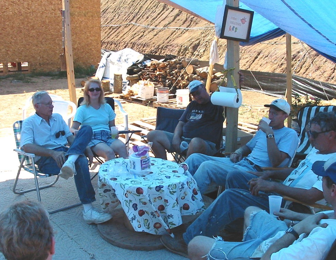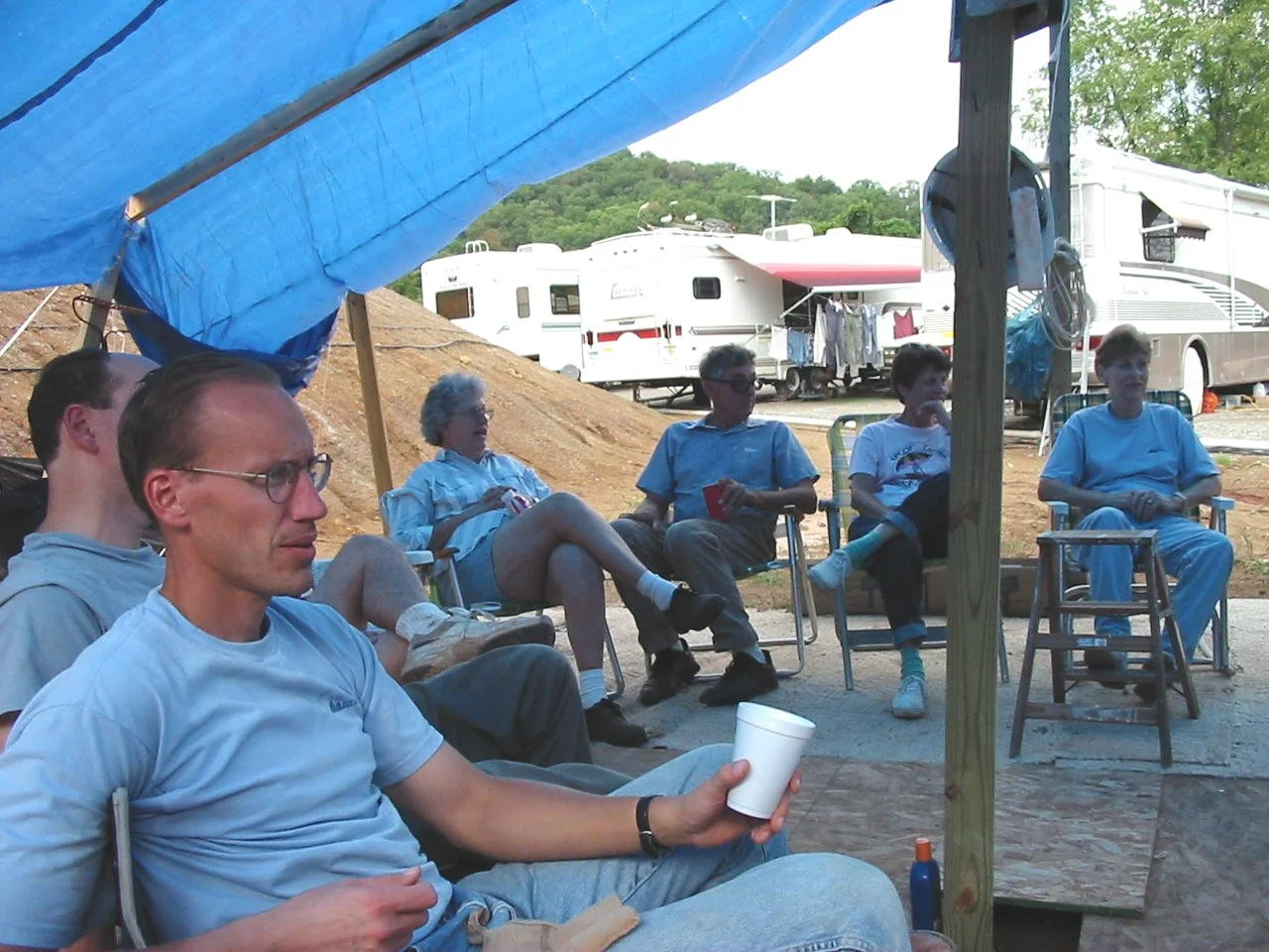 A few photos show the break area where lunches were served, breaks were taken, and Bible studies took place. The blue-tarp covered area was located where the playground is now. One photo also shows some travel trailers where the Laborers for Christ families lived while they worked on the project.