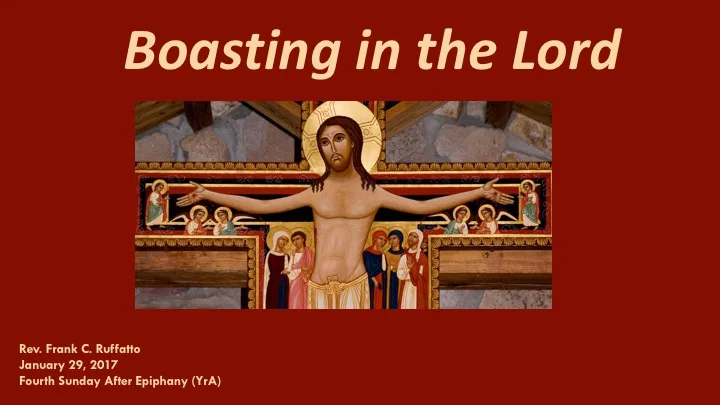 Boasting in the Lord Scripture ReadingsPsalm 15Micah 6:1–8 1 Cor. 1:18–31Matt. 5:1–12 2017, SermonRev. Frank C. RuffattoJanuary 26, 2017Epiphany 2017Comment Facebook0 Twitter LinkedIn0 Reddit Tumblr Pinterest0 0 Likes